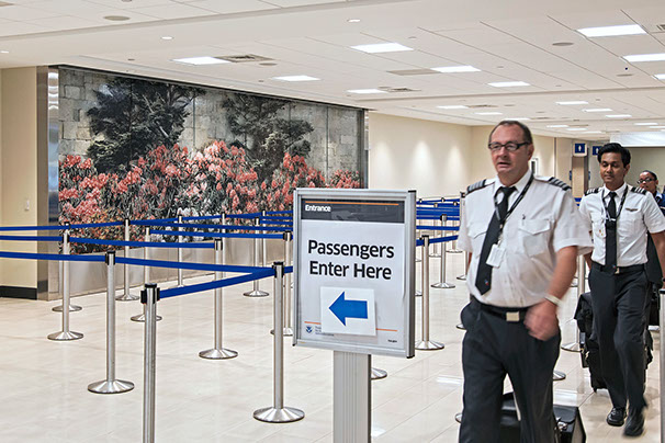 The piece, a permanent commission of Greenville-Spartanburg airport was inspired by early 20th century hand-colored postcards. The image is a photographic rendering of mountain blossoms shot in the nearby Smoky Mountains. The image, a little larger than life scale, invites the viewer to step into a garden informed as much by memory as imagination.